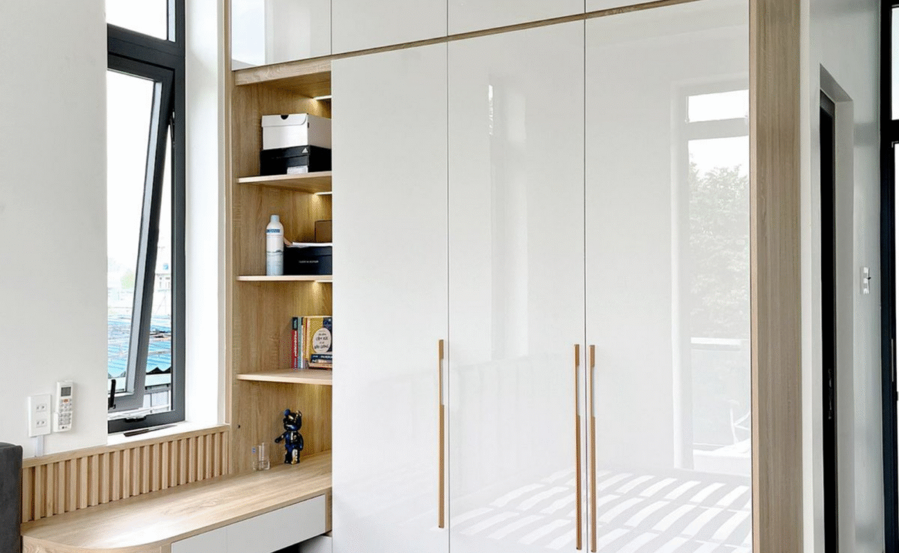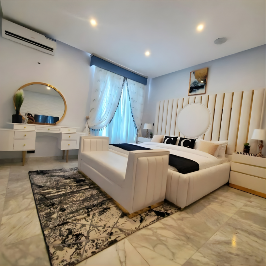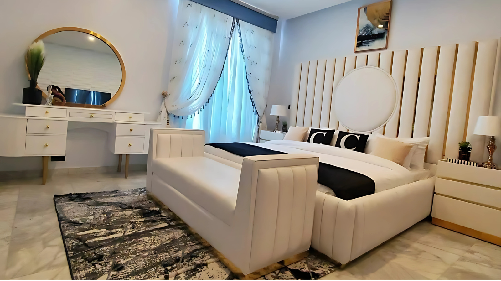 Modern White Upholstered Bed with Gold Detail and Footstool